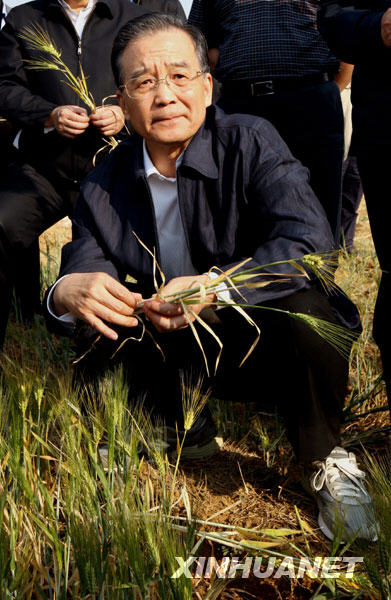 這是3月19日,溫家寶來到陸良縣芳華鎮(zhèn)獅子口村萬畝大麥示范田,實地察看農(nóng)作物受災(zāi)情況。 新華社記者 姚大偉 攝