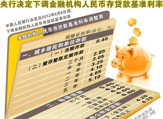 | 中國人民銀行決定,自2012年6月8日起金融機構一年期存款基準利率和一年期貸款基準利率均下調0.25個百分點,其他各檔次存貸款基準利率及個人住房公積金存貸款利率相應調整。 |