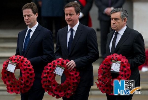 保守黨黨首卡梅倫、工黨黨首布朗、自民黨黨首克萊格,在儀式舉行時并排站立,并敬獻了花圈。