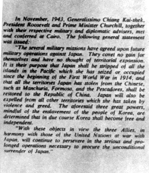 1943 年11月22日至26日,中、美、英三國首腦在埃及首都開羅會晤。在開羅會議中,三國首腦簽署了《開羅宣言》,規(guī)定“東北與臺灣必須歸還中國”。圖為《開羅宣言》英文原版。