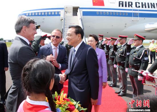 經中歐雙方商定,中國國務院總理李克強于當地時間6月28日下午乘專機抵達比利時首都布魯塞爾,出席第十七次中國歐盟領導人會晤。李克強總理夫人程虹同機抵達。中新社發 劉震 攝