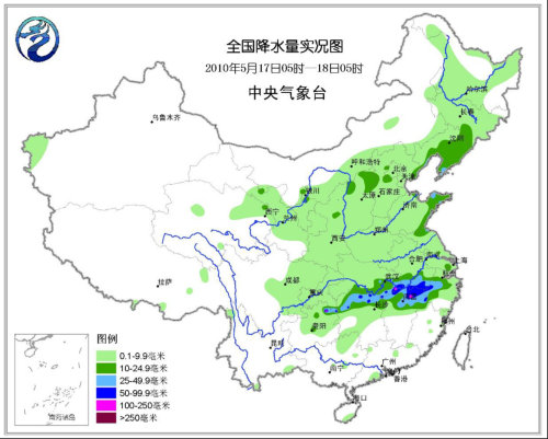 圖1 全國降水量實況圖(2010年5月17日05時~18日05時)
