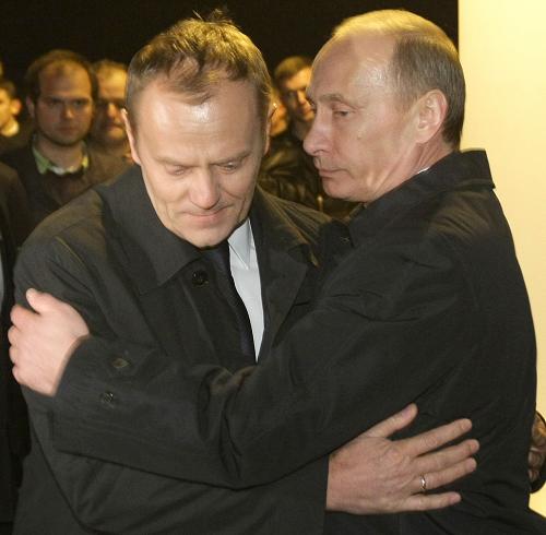 4月10日,在俄羅斯斯摩棱斯克的波蘭總統(tǒng)專機(jī)失事現(xiàn)場,俄羅斯總理普京(右)安慰波蘭總理圖斯克。普京和圖斯克在這里向遇難者敬獻(xiàn)鮮花,表示哀悼。波蘭總統(tǒng)卡欽斯基乘坐的專機(jī)10日在從華沙飛往斯摩棱斯克市途中,在斯摩棱斯克“北方”軍用機(jī)場附近降落時失事,機(jī)上97人全部遇難。新華社/法新