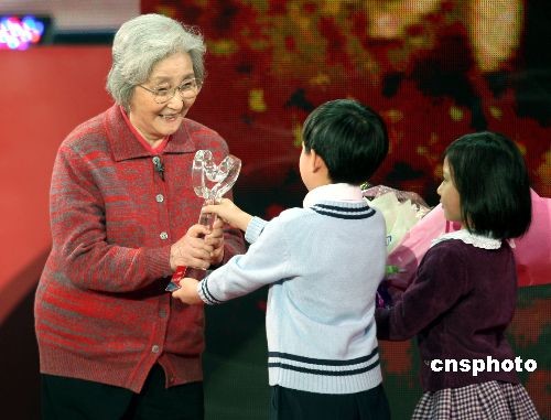 資料圖片:2月17日晚,中國中央電視臺舉辦的《感動中國》2007年度“十大人物”評選揭曉,著名科學家錢學森當選。因身體原因,他的妻子替這位《感動中國》2007年度“十大人物”排頭兵出席頒獎典禮。中新社發 宋吉河 攝