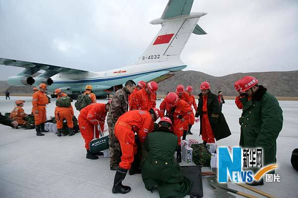 4月14日,四川救援隊(duì)抵達(dá)玉樹(shù)機(jī)場(chǎng)。 4月14日19時(shí)44分,空軍運(yùn)輸航空兵某師謝昌強(qiáng)機(jī)組運(yùn)送四川救援隊(duì)52名救援隊(duì)員和設(shè)備,從成都空軍某機(jī)場(chǎng)起飛后順利抵達(dá)玉樹(shù)機(jī)場(chǎng)。新華社發(fā)(劉應(yīng)華 攝)