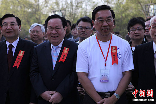 4月22日,北京清華大學(xué)校長(zhǎng)顧秉林(左二)與臺(tái)灣新竹清華大學(xué)副校長(zhǎng)葉銘泉(左三)共同出席北京清華大學(xué)新清華學(xué)堂揭幕儀式。4月24日是清華大學(xué)百年校慶紀(jì)念日,兩地清華大學(xué)將共同慶祝百年華誕,并各派副校長(zhǎng)帶隊(duì)前往參加慶典。中新社發(fā) 蘇丹 攝