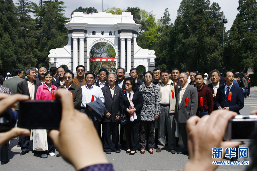 4月24日,校慶日返校的老校友們在清華二校門前合影留念。