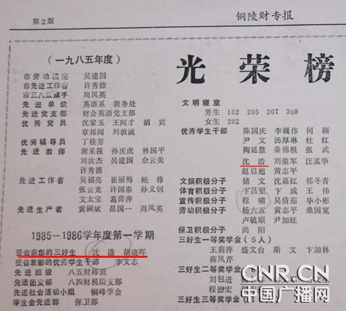 沈浩在上學(xué)期間所取得的成績,當(dāng)時已經(jīng)改名。(中廣網(wǎng) 陳曉冉攝)