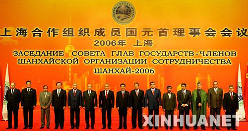 這是2006年6月15日,出席上海合作組織成員國元首理事會第六次會議的中國國家主席胡錦濤同與會其它國家和有關國際組織的領導人在會場合影。新華社發