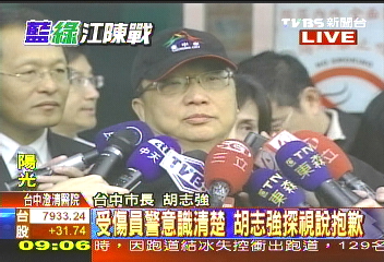 受傷警察意識清醒,在胡志強(qiáng)探視時還說“抱歉”。來源:臺灣TVBS電視臺