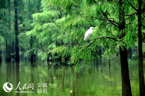 置身于滁州市來(lái)安縣雷官鎮(zhèn)的池杉湖濕地公園,一株株蒼翠的池杉矗立水中,偉岸挺拔,鳥(niǎo)兒或站立枝頭,或群起盤(pán)旋,三三兩兩的游客漫步于水邊的觀(guān)景步道,一派人與自然和諧相處的景象。