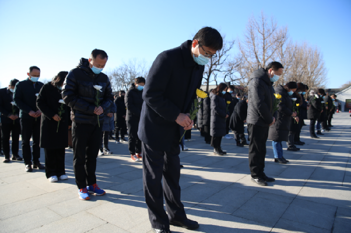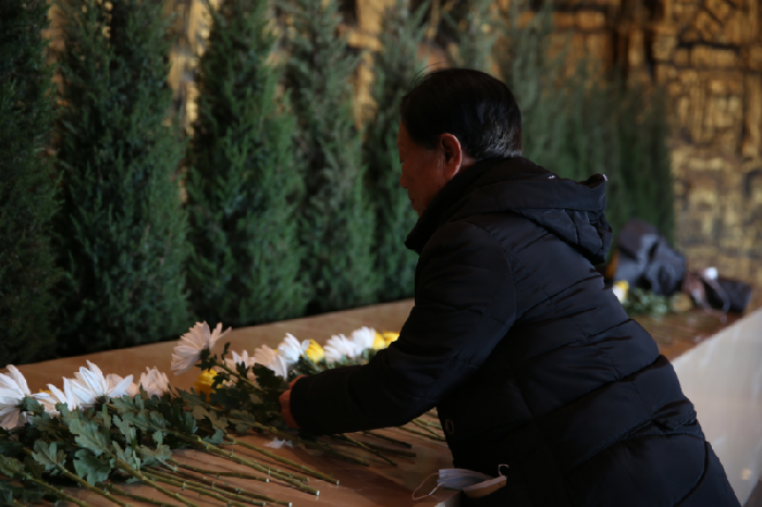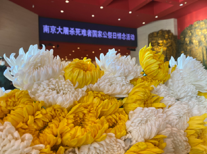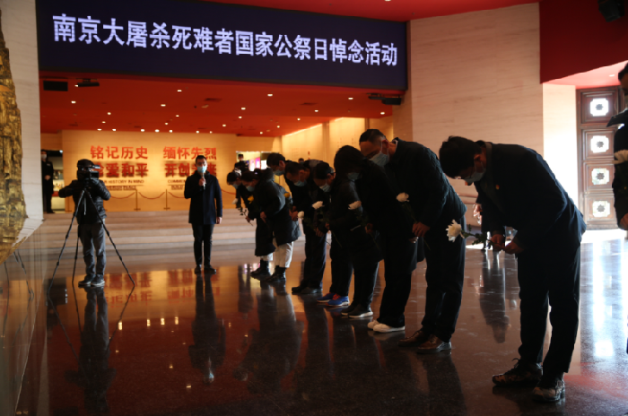 10時,《義勇軍進行曲》響起,現場百余名參與儀式的活動人員高唱中華人民共和國國歌,全體人員為所有慘遭日本侵略者殺戮的死難同胞默哀。隨后,他們依次將鮮花敬獻于該館序廳“銅墻鐵壁”雕塑前。