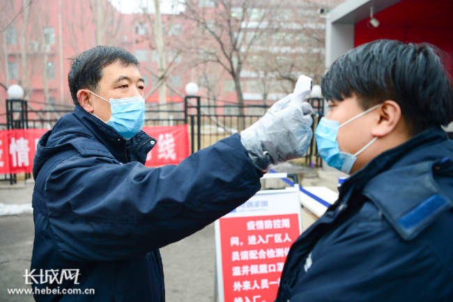 鮑守坤為入廠人員測體溫。河鋼集團承鋼公司供圖