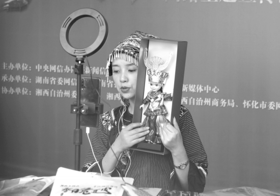 11月18日,湘西州花垣縣十八洞村,參加“決勝2020”網絡主題活動的主播正在直播介紹苗族風情產品。圖/石林榮