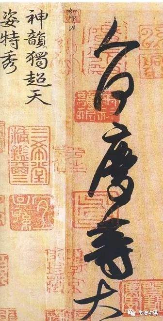 與此帖中其他21字相比, “相” 字給人突兒蹊蹺之感,引人思索。過了“相”字,筆鋒再次急起直追,震蕩綿回直至終了。正是“大鵬轉風,長鯨噴浪懸崖墜石,驚電遺光”。