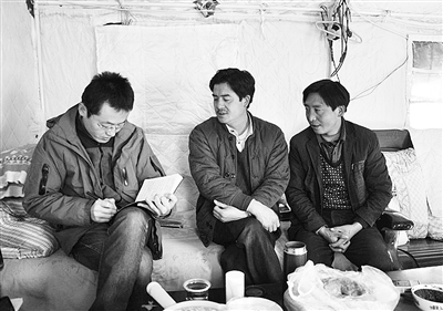 1月20日,本報記者陳發(fā)明(左一)在甘肅岷縣地震災(zāi)區(qū)帳篷里采訪。