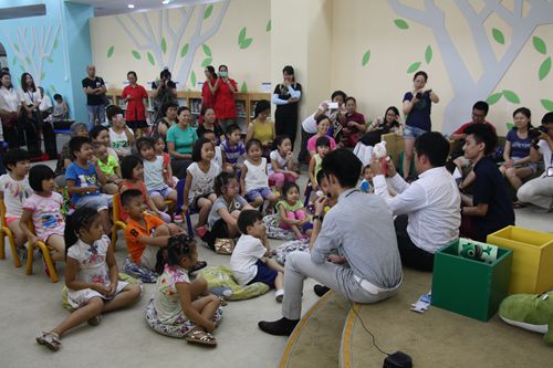8月11日在首都圖書館少兒館內,三位來自臺灣的哥哥拿著動物玩偶給小朋友們講《我不怕打針》的故事,獅子、烏龜、小豬、變色龍等齊上陣,逗得孩子們哈哈大笑。