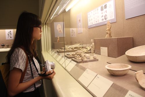 盧柔蓁在仔細觀看展覽文物(記者 李天祺攝)