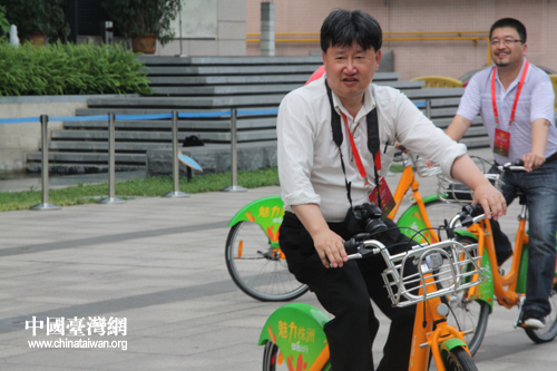 株洲在居民區(qū)、主次干道、交通樞紐、公共場所、公園景區(qū)等地,規(guī)劃建設(shè)502個(gè)公共自行車租賃點(diǎn)。圖為考察團(tuán)成員親自騎車體驗(yàn)。(中國臺(tái)灣網(wǎng) 王君飛 攝)