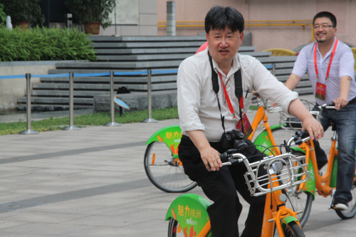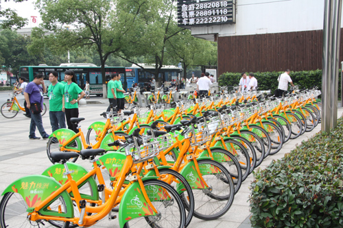 一排排的綠色自行車成為了株洲的一道亮麗風景