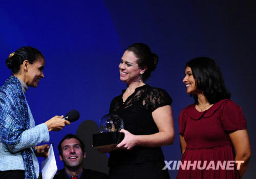12月14日,在丹麥?zhǔn)锥几绫竟臀饔浾甙驳吕讈啠ㄓ乙唬┖涂死锼沟賮唭?nèi)(右二)接受前巴西環(huán)境部長(zhǎng)瑪麗娜·席爾瓦(左一)頒發(fā)的“地球新聞獎(jiǎng)”大獎(jiǎng)--“全球公眾獎(jiǎng)”。當(dāng)天,“地球新聞獎(jiǎng)”在哥本哈根頒發(fā)。“地球新聞獎(jiǎng)”由非政府組織“新聞國(guó)際”設(shè)立,共有15個(gè)獎(jiǎng)項(xiàng),其中最重要的獎(jiǎng)項(xiàng)“全球公共獎(jiǎng)”頒給了來(lái)自巴西的年輕記者安德雷亞和克里斯蒂亞內(nèi)。新華社記者曾毅攝