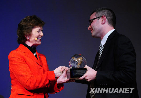 12月14日,在丹麥?zhǔn)锥几绫竟e行的“地球新聞獎(jiǎng)”頒獎(jiǎng)典禮上,愛(ài)爾蘭前總統(tǒng)瑪麗·魯濱遜(左)向美國(guó)記者戴維·別洛頒獎(jiǎng)。