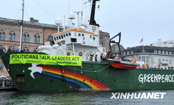 12月7日,綠色和平組織的船只在哥本哈根進行宣傳活動。當地時間7日上午,聯合國氣候變化大會在丹麥首都哥本哈根開幕。圍繞著環保和氣候變化主題,各種形式的宣傳活動在會場內外展開。新華社記者徐速繪攝