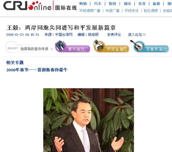 中共中央臺辦、國務院臺辦主任王毅今天向臺灣同胞發表2009年新春賀辭——《兩岸同胞共同譜寫和平發展新篇章》