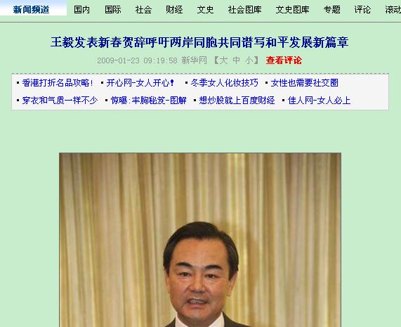 [中華網]王毅發表新春賀辭呼吁兩岸同胞共同譜寫和平發展新篇章