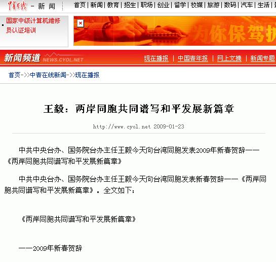 中共中央臺辦、國務院臺辦主任王毅今天向臺灣同胞發表2009年新春賀辭——《兩岸同胞共同譜寫和平發展新篇章》
