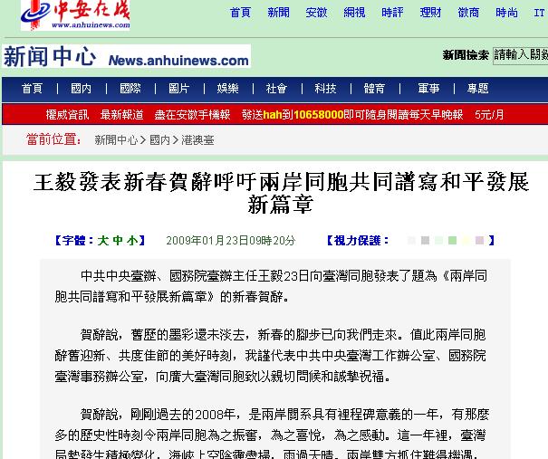 中共中央臺辦、國務院臺辦主任王毅23日向臺灣同胞發(fā)表了題為《兩岸同胞共同譜寫和平發(fā)展新篇章》的新春賀辭。