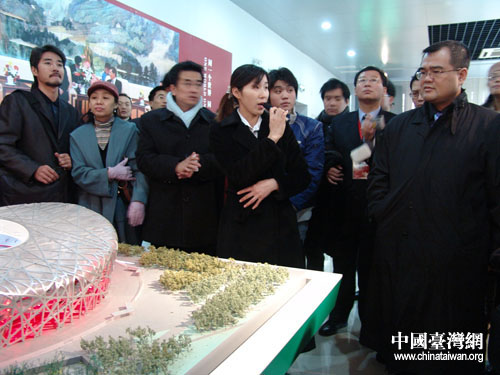 林益世等臺灣同胞在“鳥巢”模型前聽講解員講解工程情況