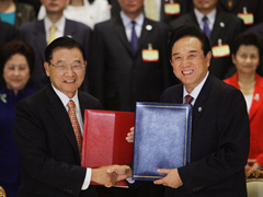 4月26日,第三次兩會領導人會談在南京舉行,海協會會長陳云林與臺灣海基會董事長江丙坤簽署了《海峽兩岸空運補充協議》、《海峽兩岸金融合作協議》、《海峽兩岸共同打擊犯罪及司法互助協議》三項協議,并就推動大陸企業赴臺投資達成原則共識。11月16日,兩岸銀行、證券及期貨、保險監管合作備忘錄(MOU)順利完成簽署。12月22日,第四次兩會領導人會談在臺中舉行,海協會會長陳云林與海基會董事長江丙坤簽署了《海峽兩岸漁船船員勞務合作協議》、《海峽兩岸農產品檢疫檢驗合作協議》、《海峽兩岸標準計量檢驗認證合作協議》三項協議,并就商簽兩岸經濟合作框架協議原則性交換意見,雙方同意將此議題作為明年兩會會談重點推動的協商議題。兩會制度化協商是兩岸關系改善發展的重要標志,協商成果促進了兩岸交流合作,惠及兩岸同胞,推動了兩岸關系和平發展的進程。