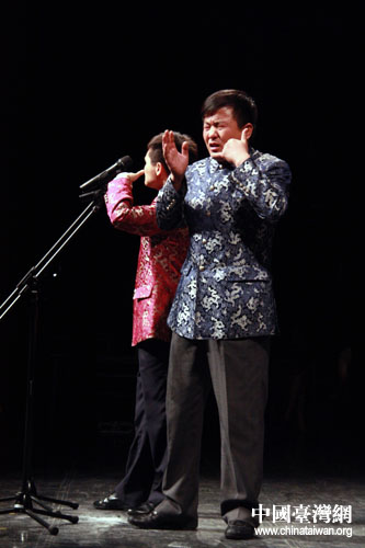5月17日晚上,嘉義縣表演藝術(shù)中心迎來了“第十一屆京味文化——臺灣嘉義親情之旅”一行的表演藝術(shù)家、工藝美術(shù)大師們。應(yīng)寧、王磊表演的《雙簧》,何云偉、李菁帶來的《學(xué)啞語》,李偉建、武賓經(jīng)典段子《咨詢熱線》,以及由臺北曲藝團(tuán)帶來的快板《雙鎖山》,相聲《地理圖之阿寶要脫團(tuán)》,讓當(dāng)晚嘉義縣表演藝術(shù)中心的觀眾從頭笑到尾。(記者 董潔 圖/文)