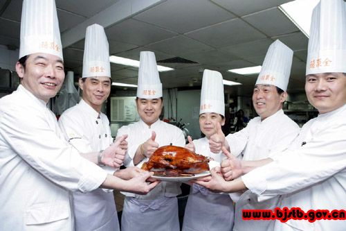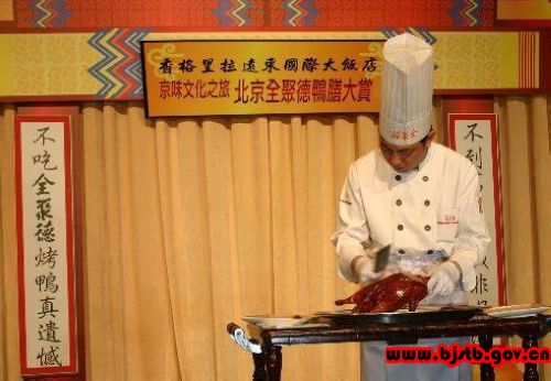 2006年4月3日不到長城非好漢、不吃烤鴨真遺憾"。這是近日在臺北遠東飯店舉行的"京味文化之旅 -- 北京全聚德鴨膳大賞"兩岸廚藝交流活動發布會上,主辦者張掛的醒目對聯。自3 月31日至4月8日在臺北舉辦的 "京味文化之旅"是北京市籌劃的一項入島交流的品牌活動。發布會上以北京全聚德集團前門店的廚師長劉志遵、鄭志強為首的七位廚藝大師和十幾只剛剛出爐的鮮脆欲滴的"北京烤鴨"著實秀了一把,成為當地媒體追逐和攝像鏡頭聚焦的中心。從而正宗全聚德北京烤鴨首次越過海峽。