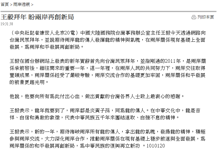 (中央社記者康世人北京20電)中國(guó)大陸國(guó)務(wù)院臺(tái)灣事務(wù)辦公室主任王毅今天透過(guò)網(wǎng)路向臺(tái)灣民眾拜年,並說(shuō)期待兩岸龍的傳人發(fā)揮龍的精神與氣魄,在兩岸關(guān)係現(xiàn)有基礎(chǔ)上全面發(fā)展,為兩岸和平發(fā)展再創(chuàng)新局。