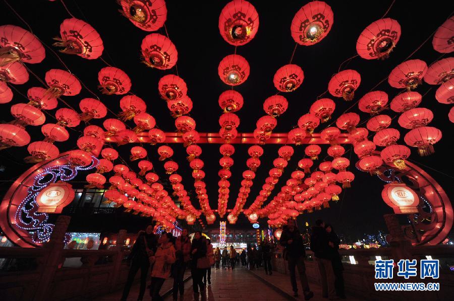 1月19日,游人在南京夫子廟景區觀燈。當晚,2012年南京秦淮燈會亮燈,南京中華門城堡及明城墻、十里秦淮兩岸、夫子廟地區等燈會展區的100多組大中型燈組、40多萬盞花燈將整個夫子廟——秦淮風光帶裝扮成燈的海洋,再現了“秦淮燈火甲天下”的盛世美景。新華社記者 韓瑜慶 攝