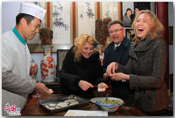 中國年要包餃子,吃慣了面包的老外對中國餃子很有興趣,他們在周村家庭飯店里學(xué)包餃子格外開心。 張愛東 攝