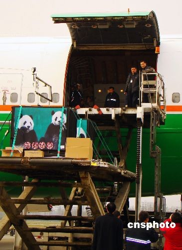 12月23日13時(shí)40分,在“家鄉(xiāng)人”舉行隆重的歡送儀式后,贈(zèng)臺(tái)大熊貓“團(tuán)團(tuán)”“圓圓”登上“熊貓專機(jī)”,臺(tái)灣長(zhǎng)榮航空公司波音七四七-四00客貨機(jī)隨后載著它們和贈(zèng)臺(tái)17棵珙桐樹(shù)苗飛往寶島臺(tái)灣。 中新社發(fā) 霍潺 攝