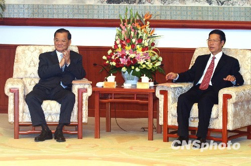 7月29日,中共中央政治局委員、中共天津市委書記張高麗在天津迎賓館會見來津出席第二屆天津——臺灣投資合作洽談會的中國國民黨榮譽主席連戰。 中新社發 郭曉帆 攝
