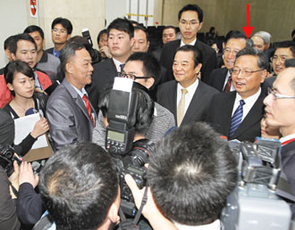 5月5日一下飛機,黃小晶(箭頭指處)對臺灣民情立刻有了“初體驗”,媒體蜂擁相迎,黃小晶立即隨問隨答,像是有備而來。