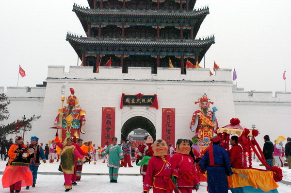 1月11日,沈陽關東廟會在位于棋盤山風景旅游開發區的關東影視城向游人開放。主辦方在廟會期間將舉辦對春聯、貼窗花年畫、四平燈市等民俗活動,呈現出上世紀二三十年代沈陽城獨特的關東風情。(徐如光攝)