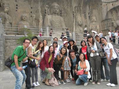 下午,同學們來到九朝古都洛陽,他們冒著酷暑參觀了世界文化遺產——龍門石窟。過去只是在書本上讀到過一點的中華文化的厚重瑰寶展現在同學們面前,讓同學們忘記了酷熱,不斷地向導游發問,相互之間也在不停的合影留念。