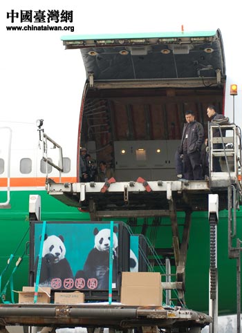 12月23日,成都雙流機(jī)場(chǎng),裝載贈(zèng)臺(tái)大熊貓“團(tuán)團(tuán)”、“圓圓”的籠子緩緩進(jìn)入專機(jī)機(jī)艙。中國臺(tái)灣網(wǎng) 田云鵬 攝