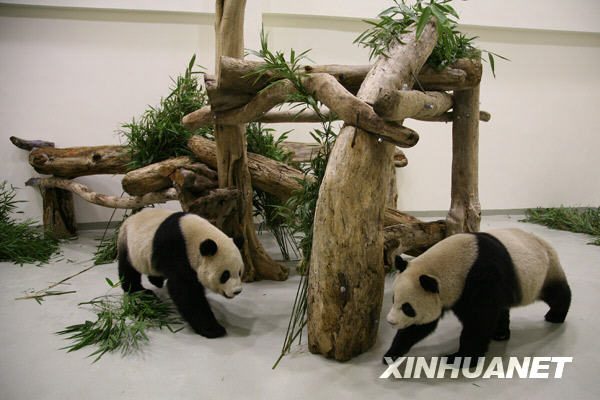 12月23日,“團團”“圓圓”在適應新家環境。新華社發