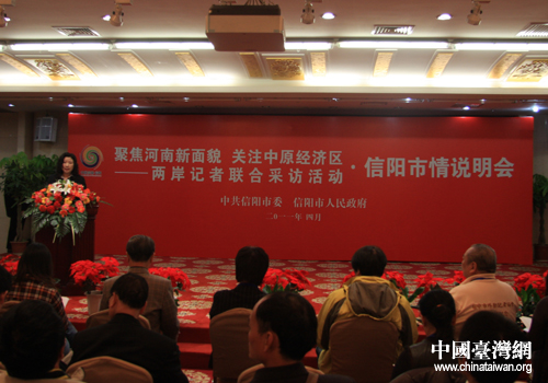 “2011年兩岸記者聯(lián)合采訪河南”記者走進河南信陽,信陽市政府舉行市情說明會(中國臺灣網(wǎng) 吳捷 攝)