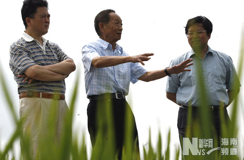 袁隆平(中)等在海南“南繁”基地察看育種水稻的生長情況