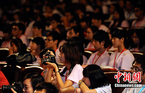 7月6日晚,全國臺聯(lián)“2010年臺胞青年千人夏令營”在北京京西賓館大禮堂開營。來自島內(nèi)、海外的千余名臺胞青年匯聚于此,開啟暑期大陸之旅。圖為臺灣學生被精彩的表演吸引。中新社發(fā) 劉震 攝