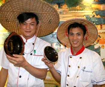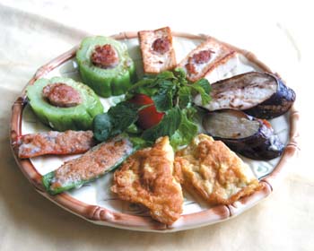 用鄉(xiāng)下的豬五花肉與魚肉剁成餡(魚肉在加工過程中可適量加水,以保證口感與魚肉的香味更突出),用鹽、胡椒粉及雞精調味,分別釀入豆腐、雞蛋、茄子、尖椒、涼瓜中,放入鍋中以文火煎至金黃,然后再轉入瓦煲中,以文火煲8個小時即可。此菜有燉菜的風味,但由于煎過,更加香口。