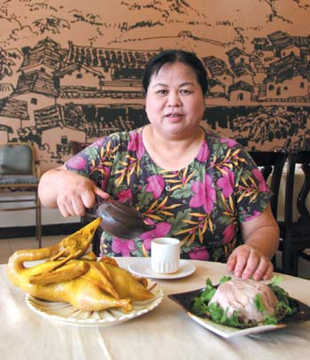 市面上鹽雞已經(jīng)泛濫成災,而鹽鴨卻比較少見。黃雪芳選用的是5斤重的正番鴨,以鹽、原只的五香料腌制一個多小時,然后再放入鋪滿粗鹽的鍋內(nèi),進行加熱制。注意要用中火,大致40分鐘就能端上桌了。這款鹽鴨的特點非常鮮明,其肉質結實而又富于彈性,鴨香味濃郁,連骨頭都有味,肥而不膩。